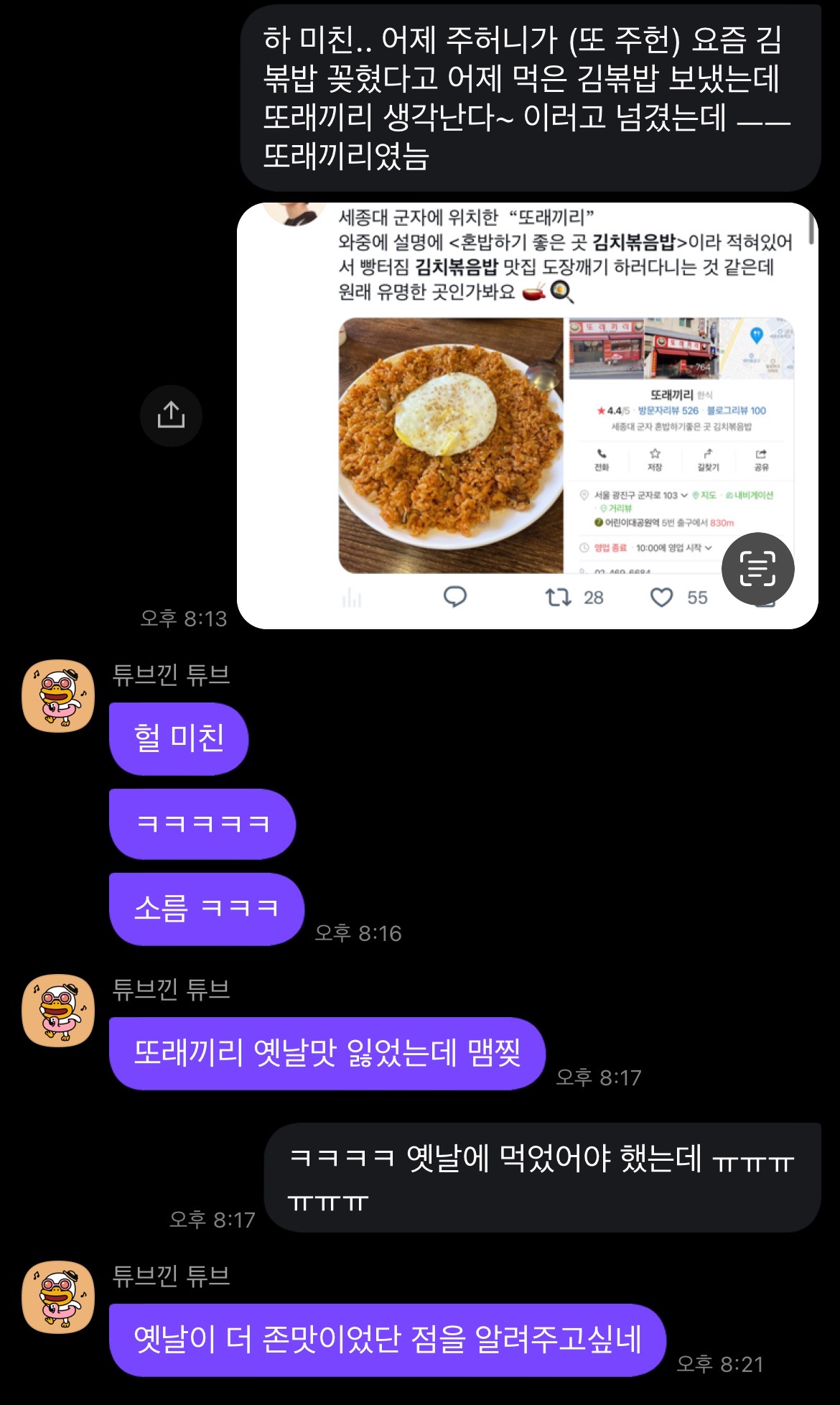 김치볶음밥에 빠져 한동안 김치볶음밥 원정대라도 구성한 것처럼 먹고다니던 주허니가 또래끼리 김치볶음밥을 올려서