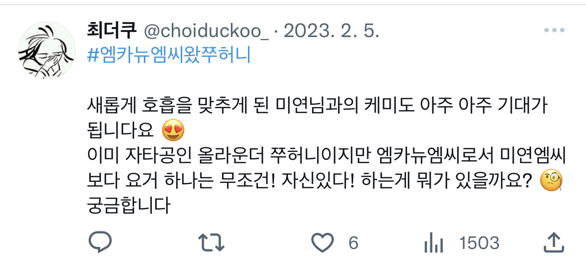 근데 진짜 적다보니까 절절문이 되는데 여튼 그건 그거고 엠씨가 된다는 소식에 또 잘 하지도 않는 트위터를 열어서 열심히 질문 이벤트에도 참여했던 기억을 기록합니다.