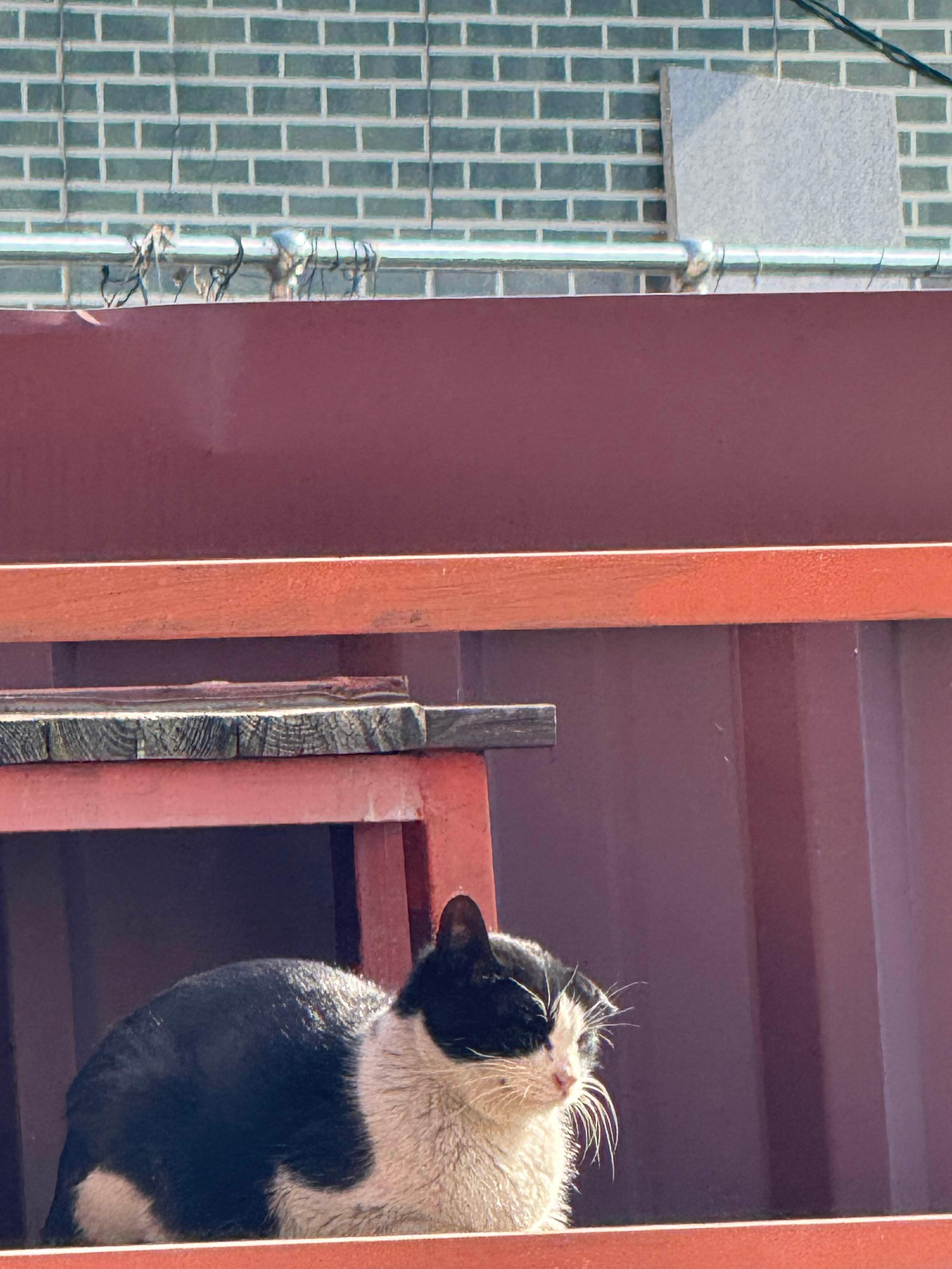 절을 바라보면서 한가롭게 볕 쬐는 냥이