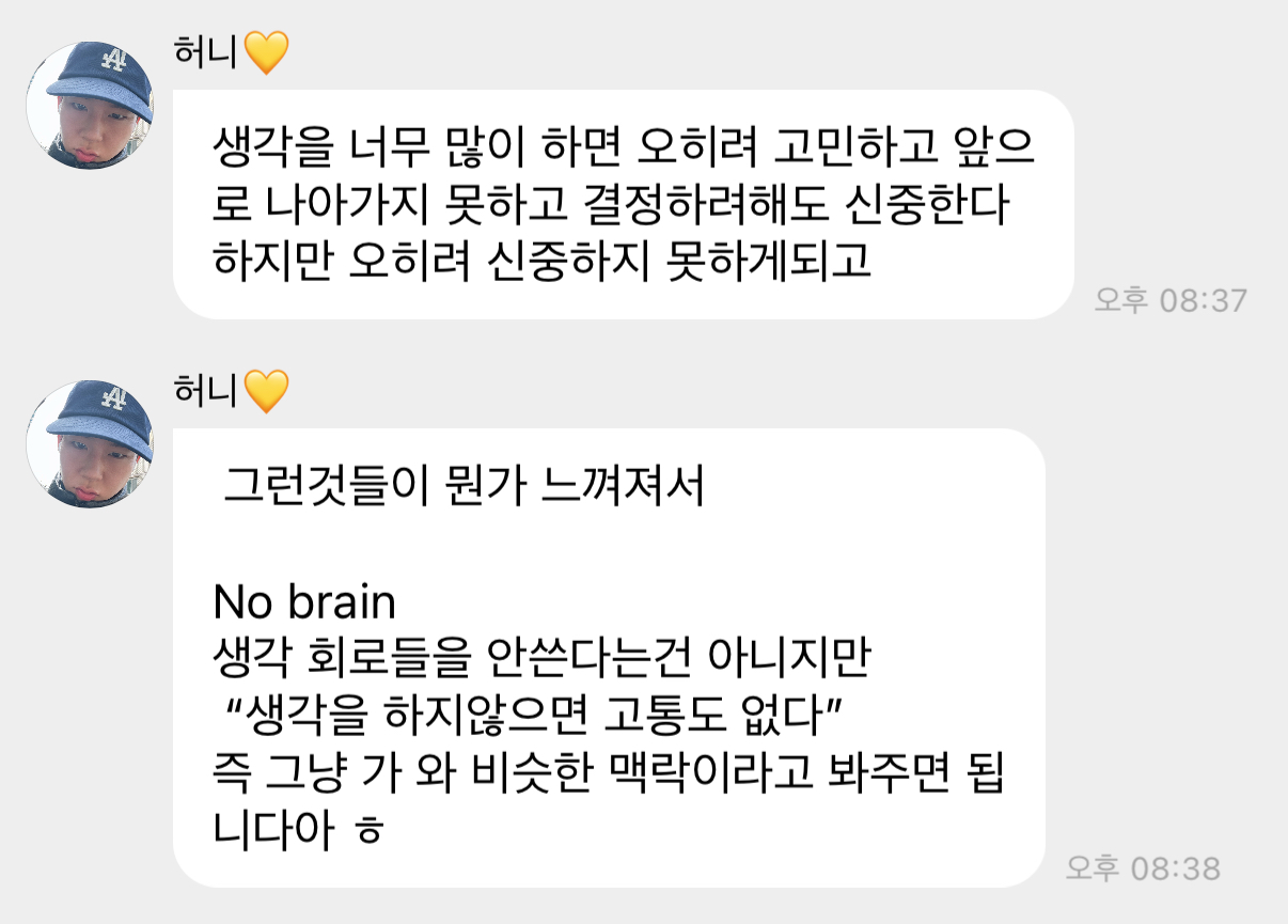 주헌이가 말해주고 싶었던 노브레인 노페인 뜻은, 너무 많이 생각하면 오히려 앞으로 나아가지 못하는 만큼 생각을 좀 줄이면 고통없이 앞으로 나아갈 수 있으니 그냥 해