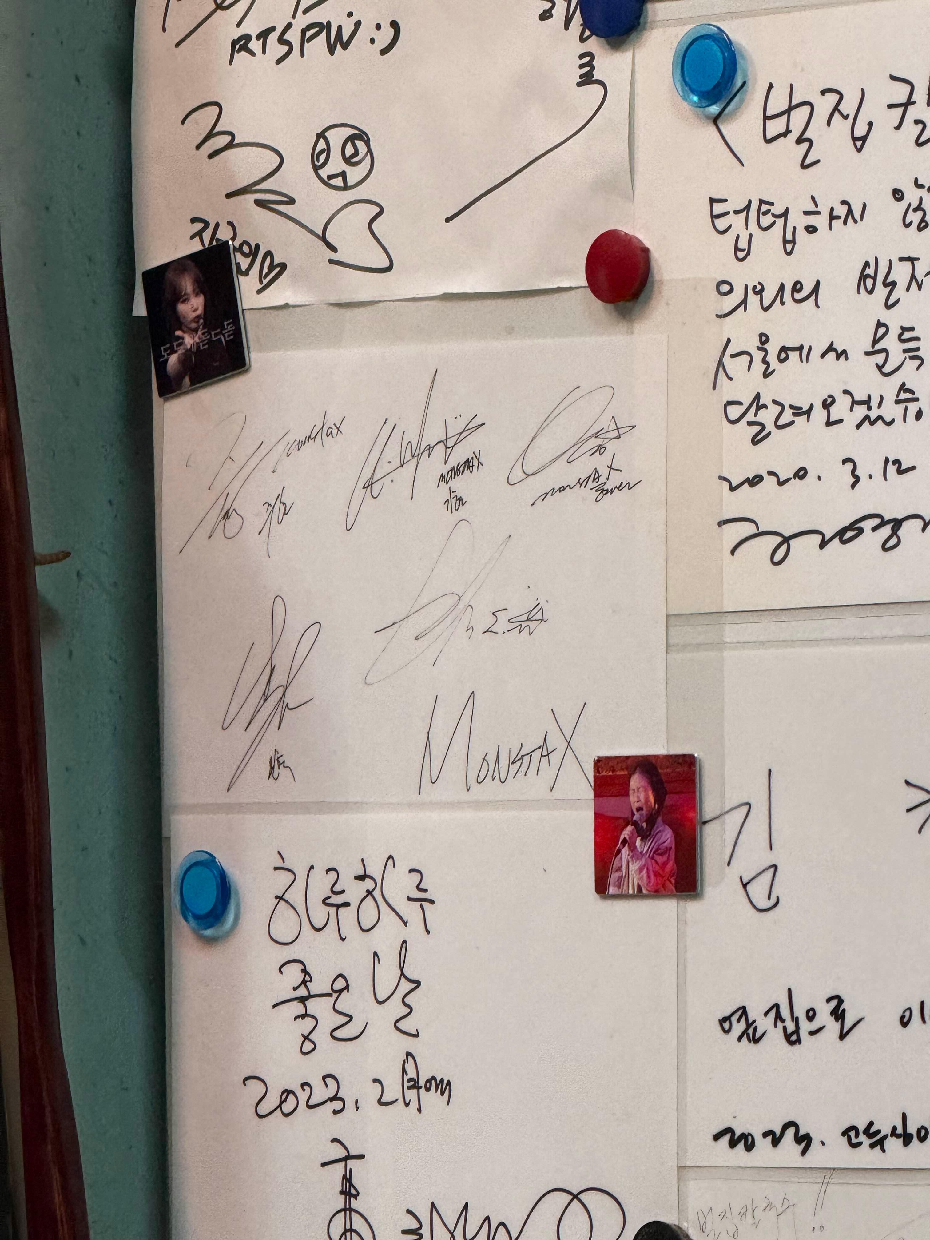 너무 오래되어서 기억이 잘 안나는데 1차를 먼저 먹었던것 같고 근처에서 2차 어디갈까 하다가 보인 곳이 여기라서, 노포기나온거 기억나서 가자고 자연스럽게 유인하니까 일행이 "몬스타엑스 때문이구만" 했음. 당연함 들어가니가 셔누사진이 똬아아아악. 맛있었고 (그냥 좀 제육 구워먹는 느낌?) 생각보다 더 노포에 뭔가 좁고 협소해서 즐겁게 먹고 다음 차를 갔던 기억이..