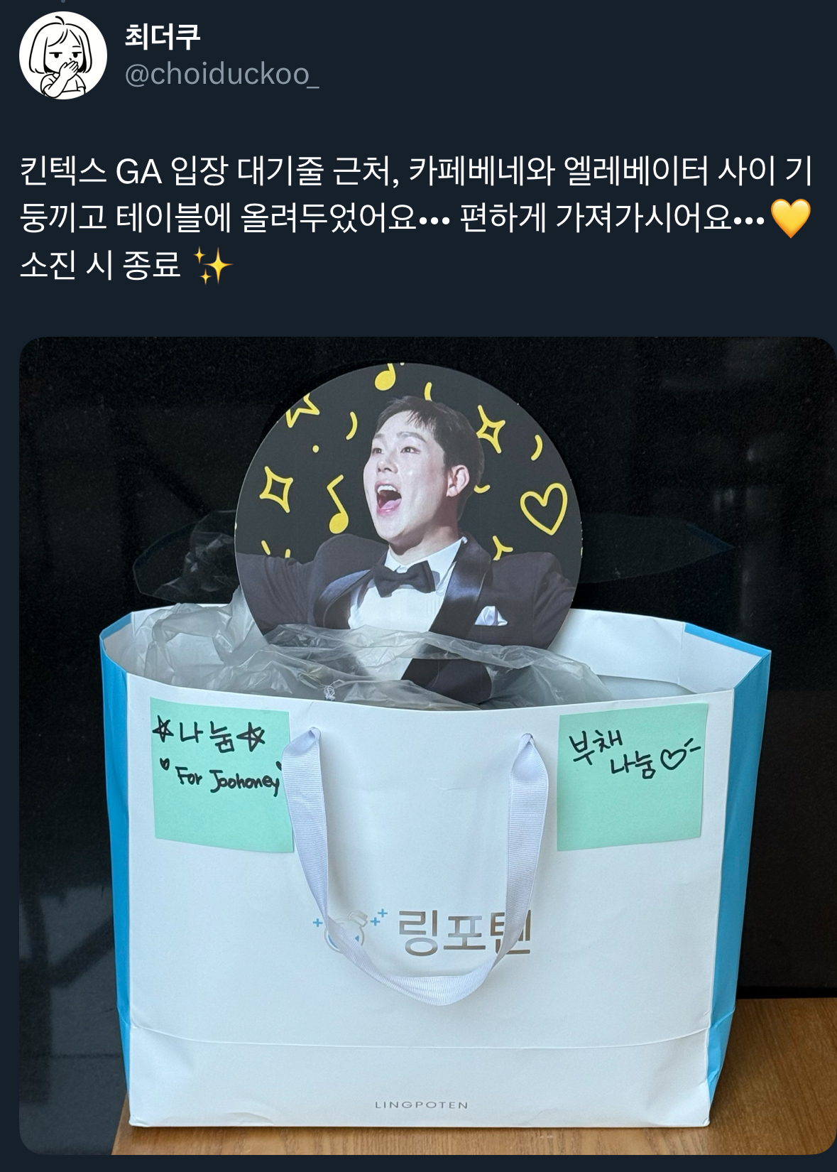 본인이 늦은시간까지 (녹음포함) 해놓고서는 밖에 있는 휀걸들 걱정에 고생많았다고 들어줘서 고맙다구 예뿌게말해